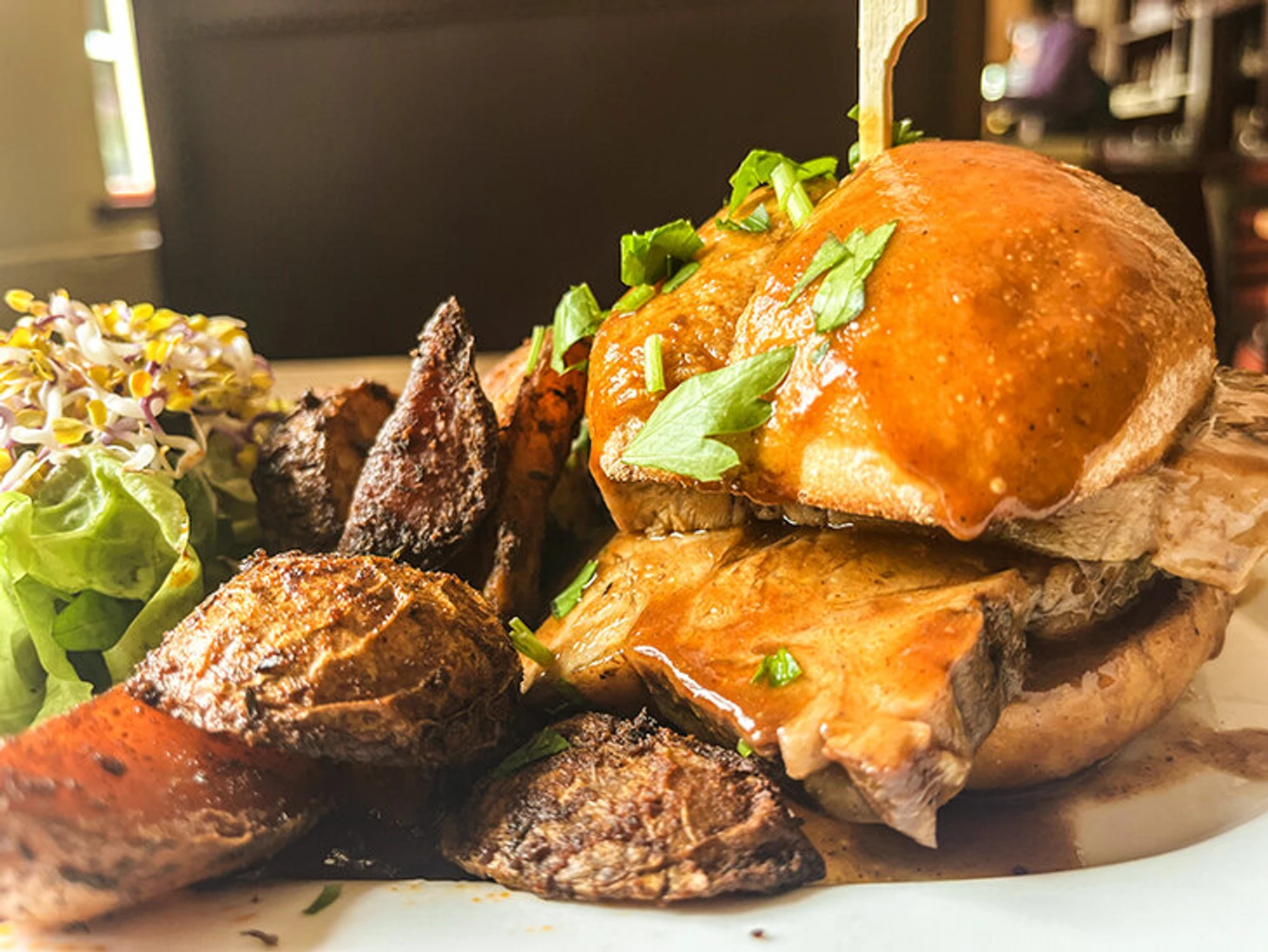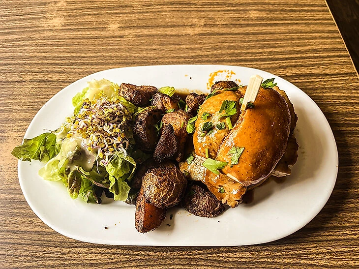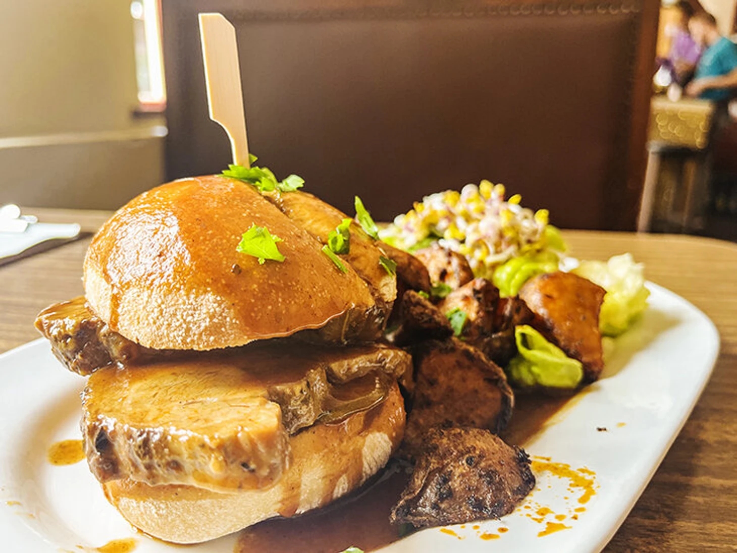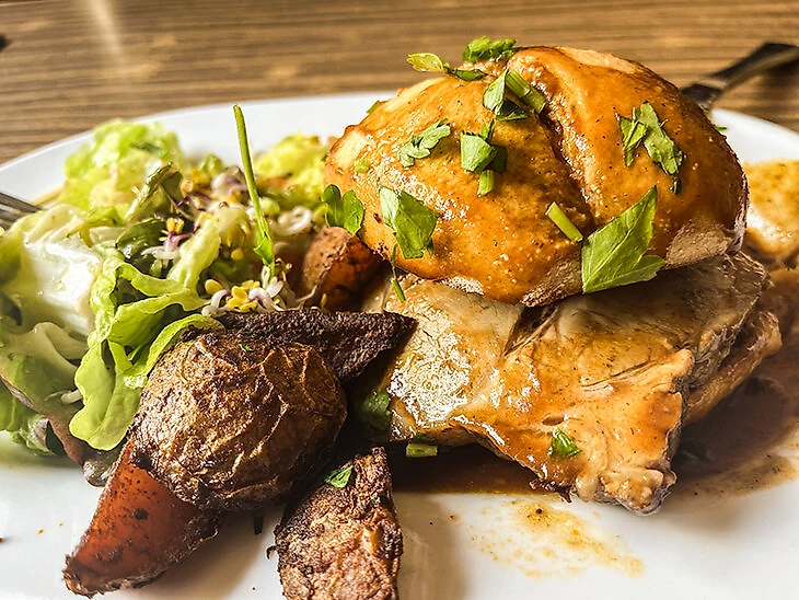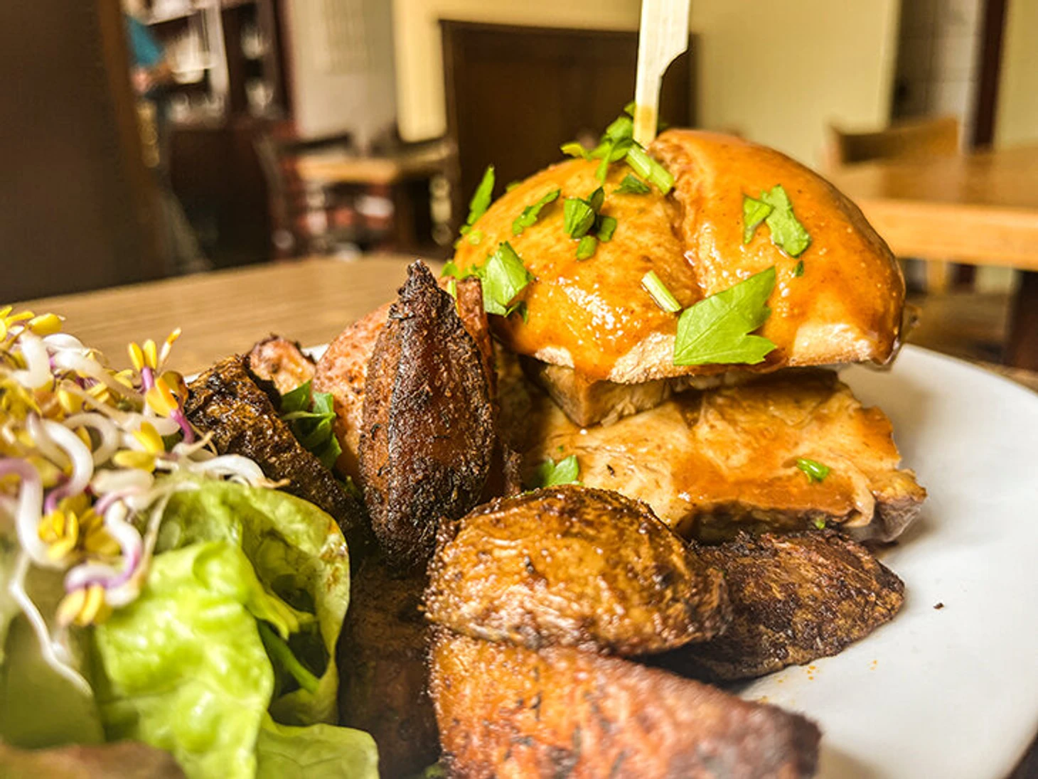 Расскажу обо всем в деталях! Между двумя булочками – два прекрасных куска мяса, горчица и соленый огурец. Рядом – запеченный картофель и салат. Все это – под вкуснейшим соусом, состав которого мне неведом.
