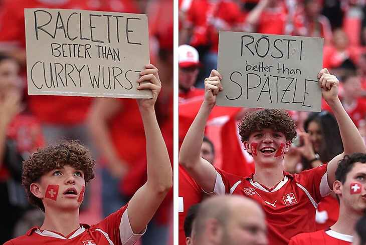 Кто-то приносил сразу два кулинарных баннера. «Раклет лучше карривурста» и «Решти лучше шпецле» от еще одного швейцарца на матче с Германией.