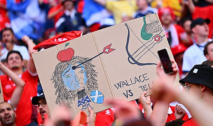 И народные герои. Швейцарец Вильгельм Телль явно побеждает на этом баннере шотландца Уильяма Уоллеса.
