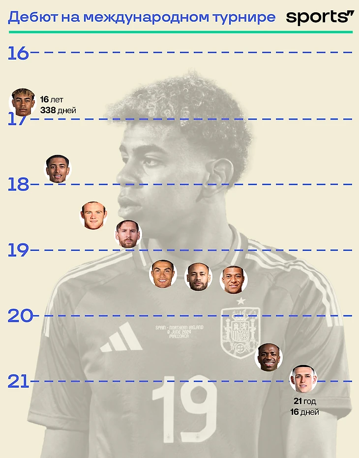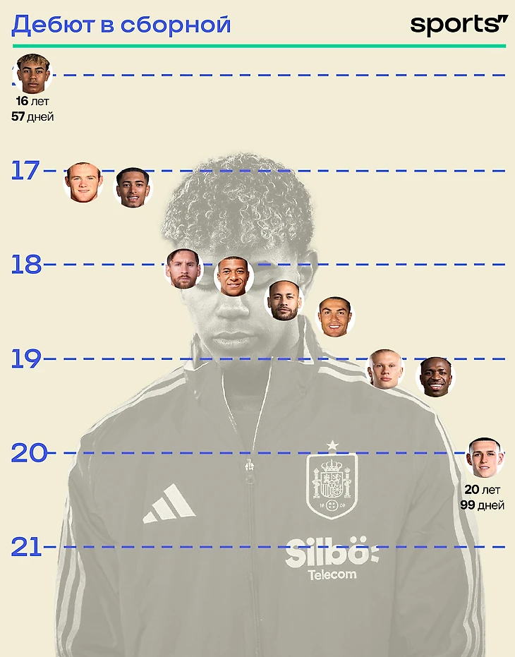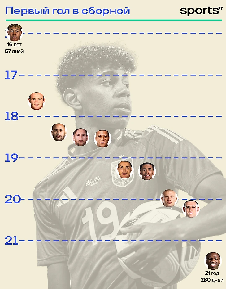 16 лет и 57 дней − на год раньше, чем любой другой в этой десятке! Рядом еще один рекорд Ямаля: 16 лет и 62 дня − самый молодой игрок в старте Испании.
