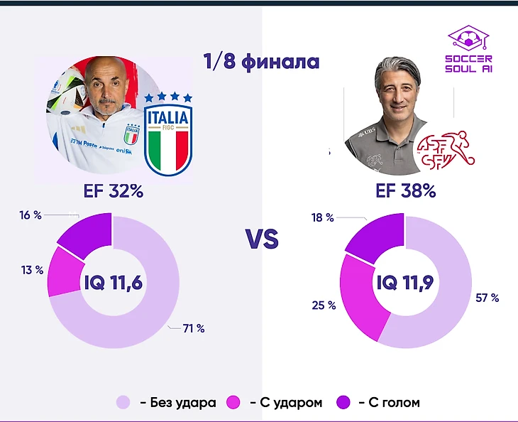 Доля сложных в голевых атаках у итальянцев – 0%. У Швейцарии – 17%. Кроме того, есть проблема с точностью ударов: у швейцарцев она в принципе одна из самых высоких на турнире – 50%, у Италии – 34%.