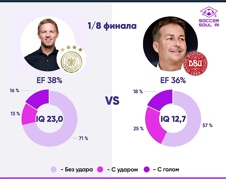В этой паре статистически всё выглядит более очевидным. Немцы – фаворит убедительный. Их средне-матчевый IQ – 23,0 смотрится солидно на фоне показателя датчан – 12,7 IQ. Эффективность продвижения также выше, но разрыв здесь небольшой (38% vs 36%).
