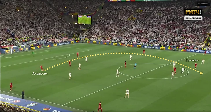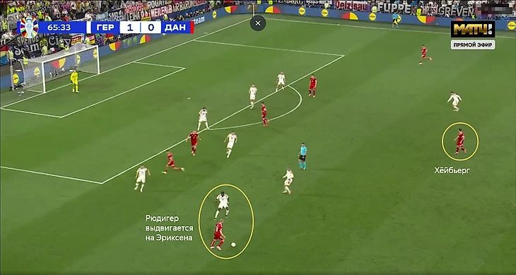 Например, здесь Рюдигер выдернулся на Эриксена. Кристиан отдал Хёйбьергу, который сделал передачу на Хёйлунда, получившего свободу в зоне, откуда ушёл Рюдигер.