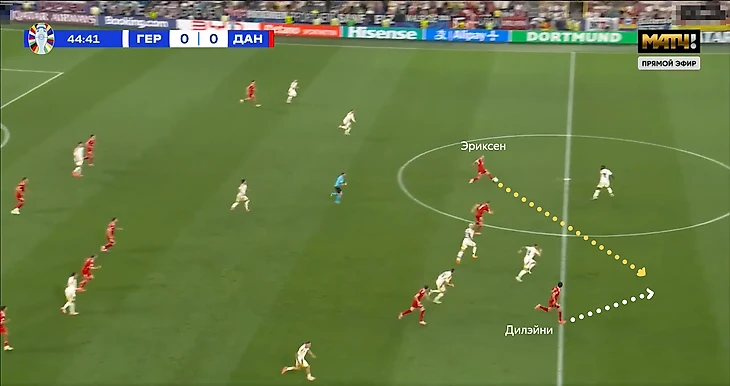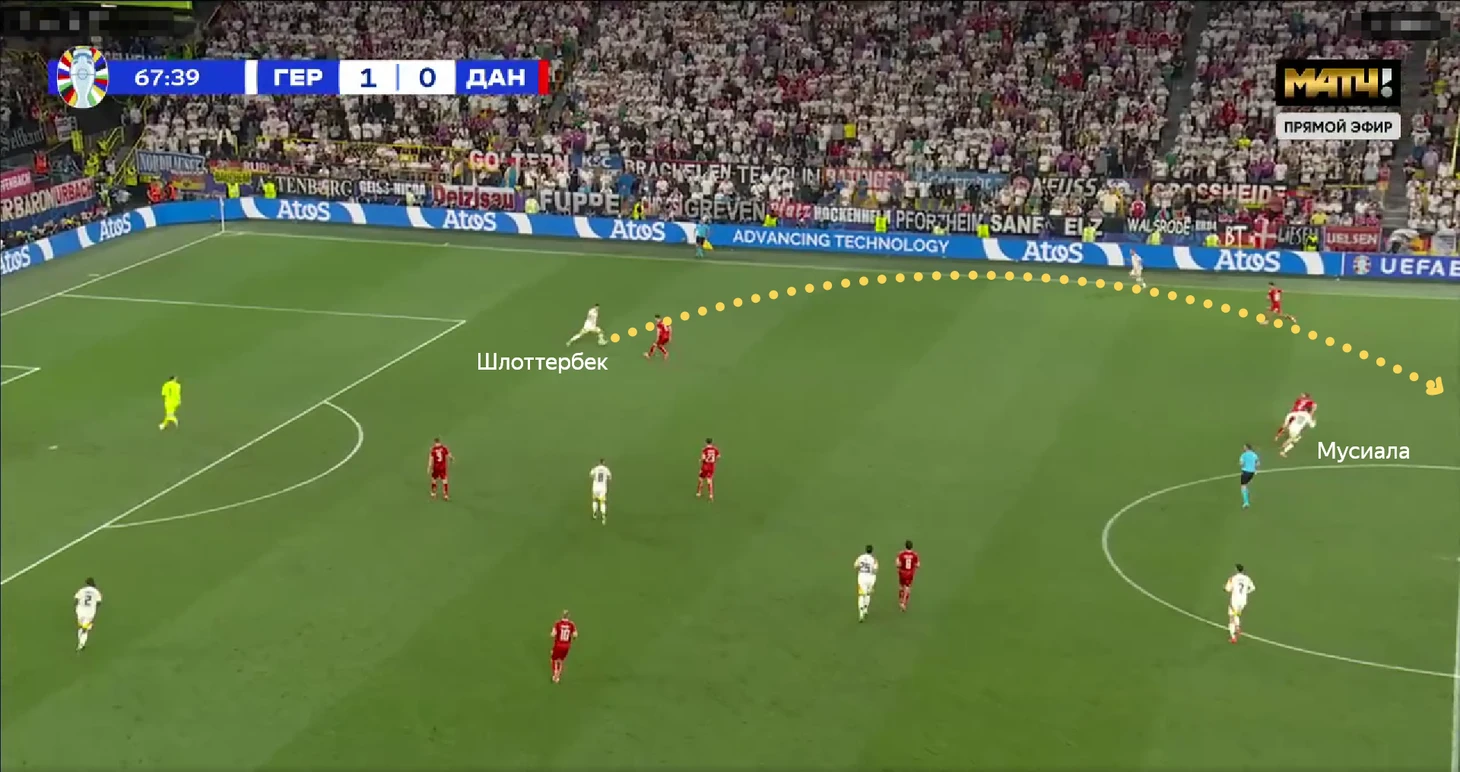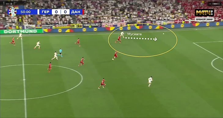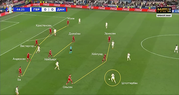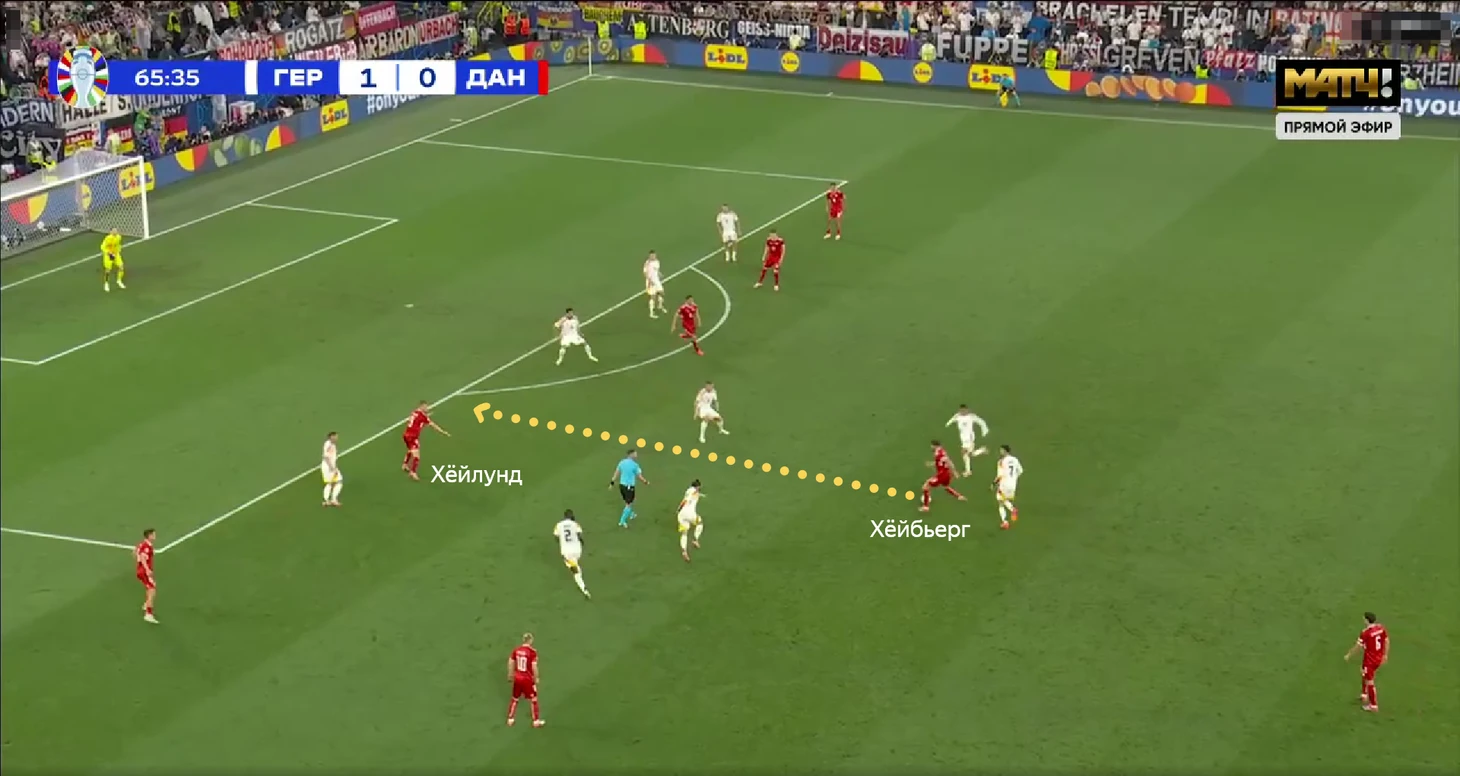 В этих эпизодах можно проследить сразу несколько характерных моментов. Во-первых, ставка Германии на подобный способ создания моментов. Во-вторых, противоречивые действия Дании, позволяющие создать ситуацию «открытого мяча»: линия обороны поднимается для поддержания компактности, а на игрока с мячом не оказывается давление.