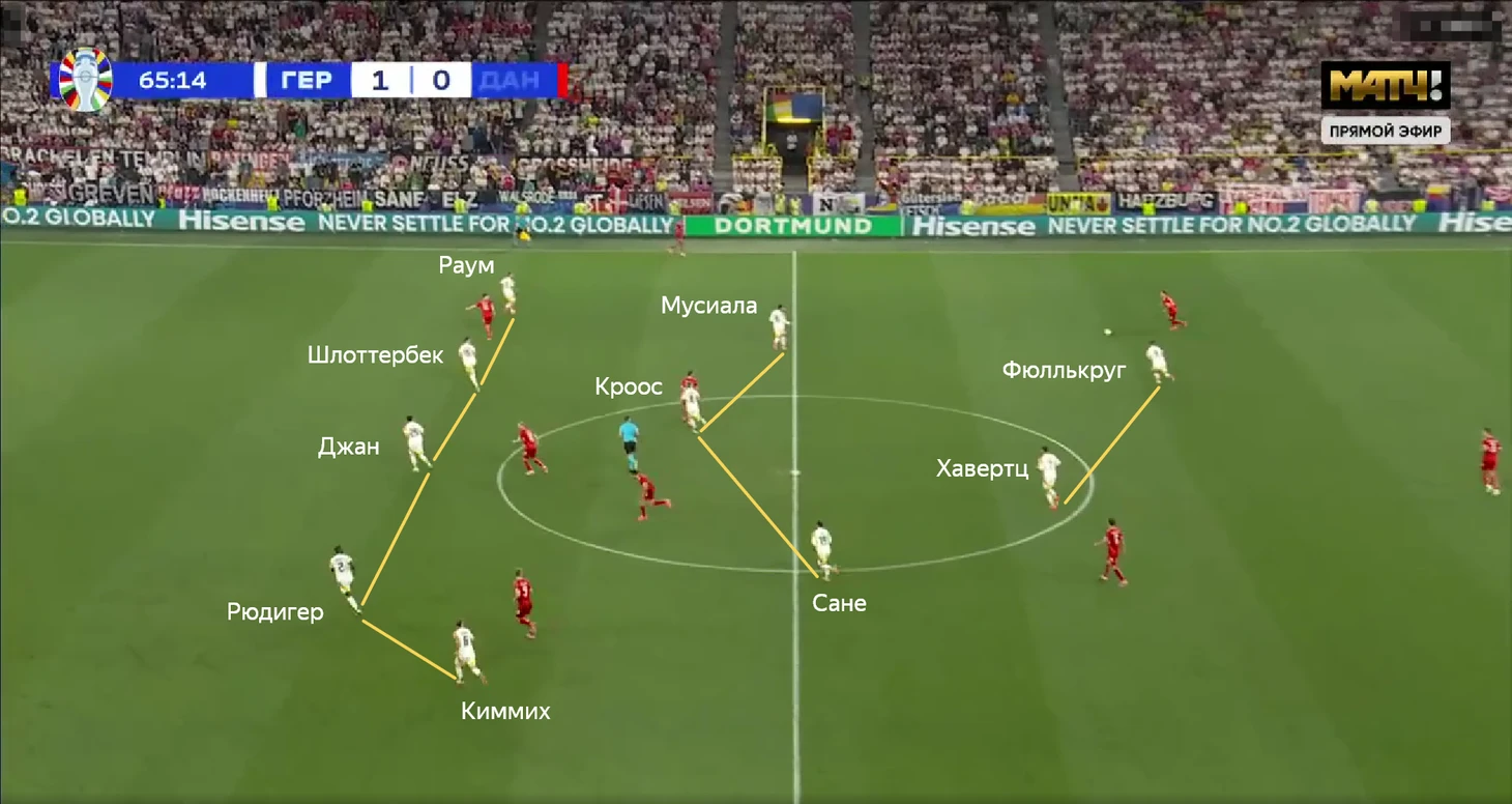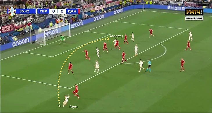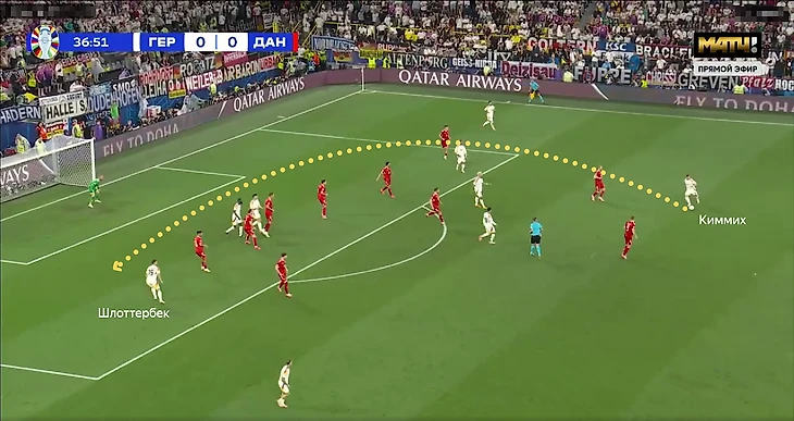 Например, в ситуациях когда датчане фокусировались на большой группе игроков Германии в центре, больше свободы могли получить фланговые футболисты немецкой сборной (Раум, Киммих) – характерная ситуация для хозяев турнира на этом Евро.
