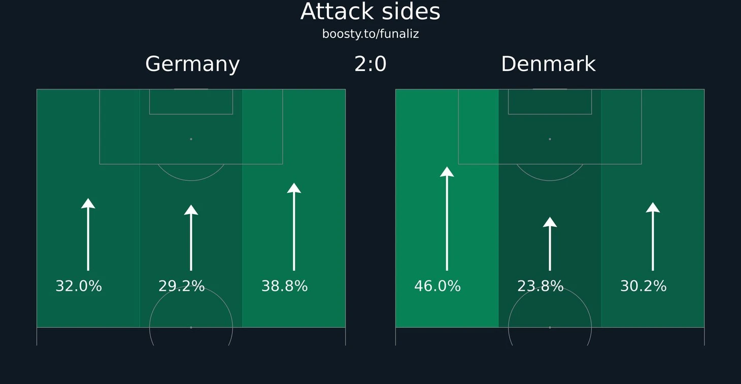 Из всех четырёх соперников Германии на этом турнире Дания играла с самой высокой линией обороны (43.89 метра) – немцы наказали в эпизодах, где высокая линия не поддерживалась интенсивным давлением на игрока с мячом.