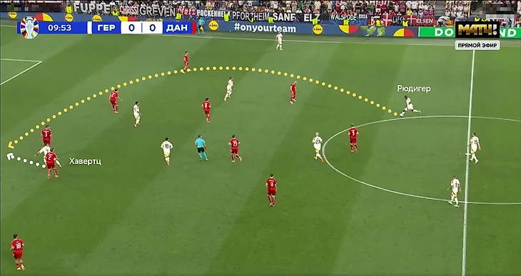 Особенно на этом Евро бросается в глаза взаимопонимание Рюдигера и Хавертца в подобных эпизодах (что по ходу турнира уже отмечал в своём телеграм-канале). Вот ещё один пример.