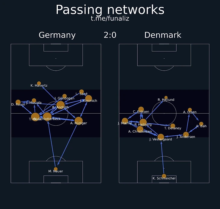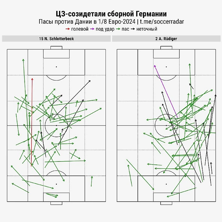 Вот карта передач Нико Шлоттербека и Антонио Рюдигера в матче против Дании. Важно понимать, что в большинстве случаев это не подачи на нападающего-столба для последующей скидки (хотя есть и такая опция с Фюллькругом), а забросы за спину оборонительной линии соперника.