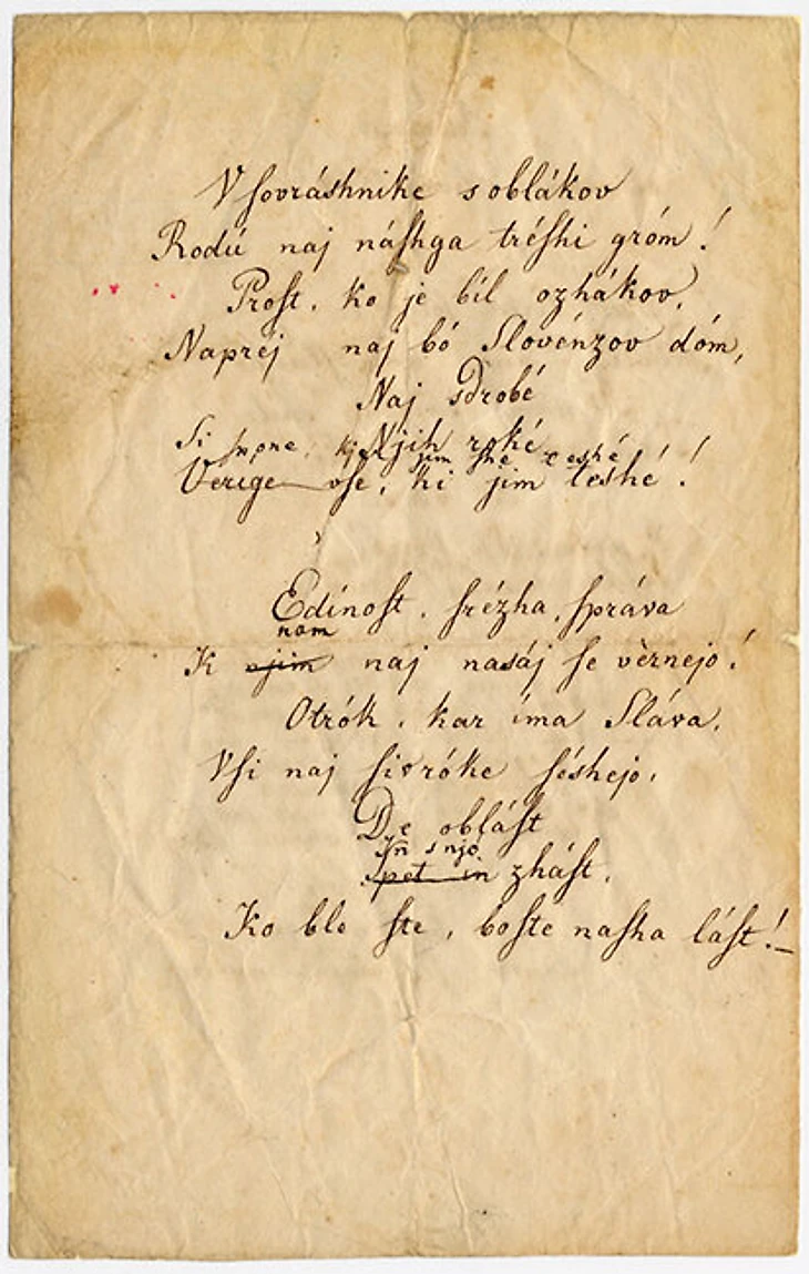 Zdravljica – это такой тост в стихах (в переводе Zdravljica и есть тост), состоящий из 9 строф. С фрагментом первой вы уже знакомы, но официальный текст гимна Словении – только седьмая строфа стихотворения. И она звучит вполне традиционно для гимна.