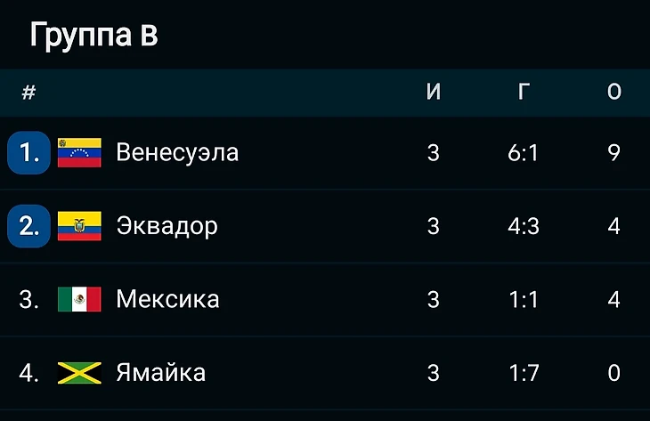 Убедительная победа сборной Венесуэлы над сборной Ямайки со счетом 3:0. Неожиданно для всех венесуэльцы сумели одержать 3 победы в группе и выйти в плей-офф с первого места с максимально возможным результатом. Будет интересно посмотреть на них в плей-офф.