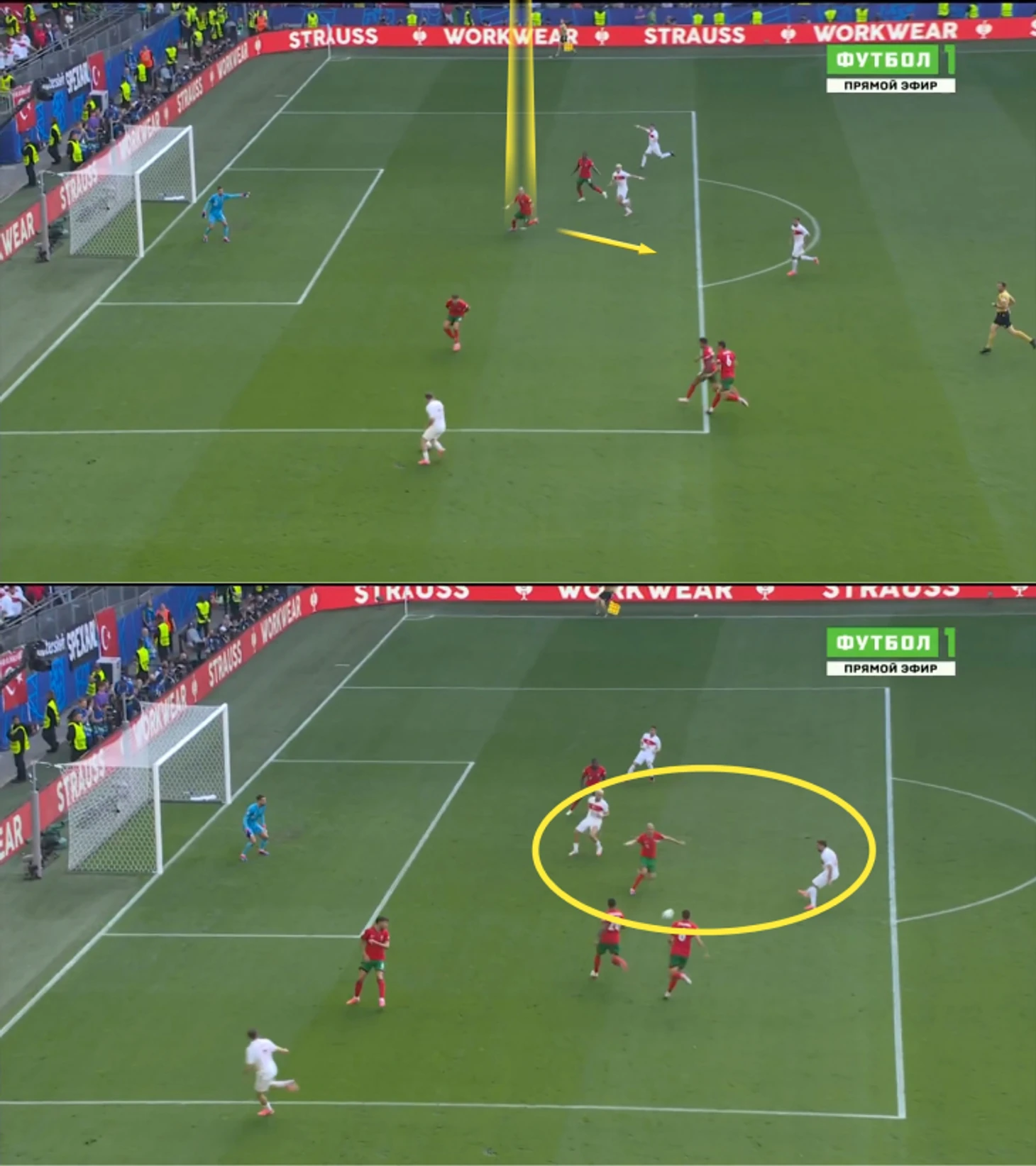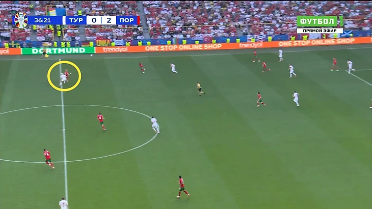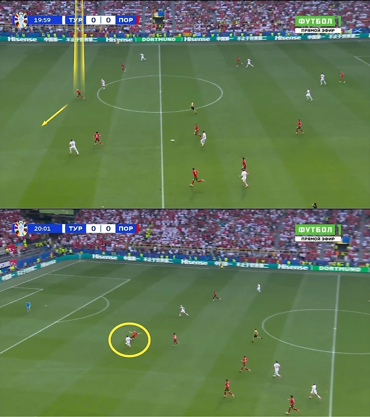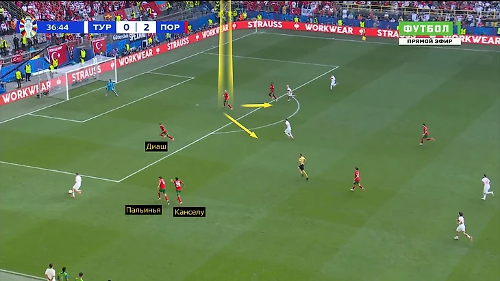 Португалия не сохранила владение, контратака продолжилась. Справа анархия: Канселу упал, Пальинья не успевал, Диаш бросился на пожар. Задача Пепе сложная: необходимо контролировать спину (Мендеш сразу против двоих, Йылмаз может выскочить на опережение или нырнуть сзади), центр оголен.