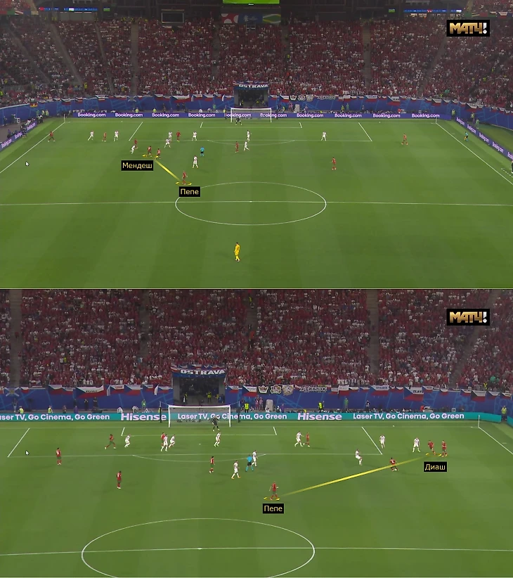 Мартинес использовал гибрид против Чехии (2:1): 5-4-1 в обороне, 3-4-3 в прессинге, трансформер в атаке из-за перехода в центр латераля Жоау Канселу. Чехия так сжималась в штрафную, что Пепе безболезненно страховал одновременные рывки Мендеша и Диаша по краям.