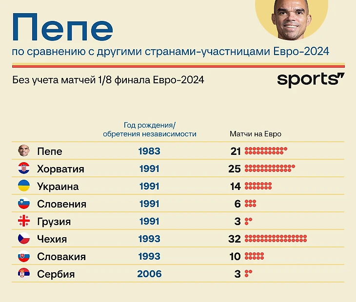 Мы часто задумываемся о его величии: самый возрастной в истории Евро, самый возрастной полевой в истории Лиги чемпионов и первый сорокалетний с голом в этом турнире. Новый ракурс великолепия Пепе: он старше семи государств на этом Евро и опытнее пяти сборных.