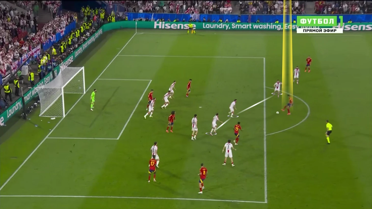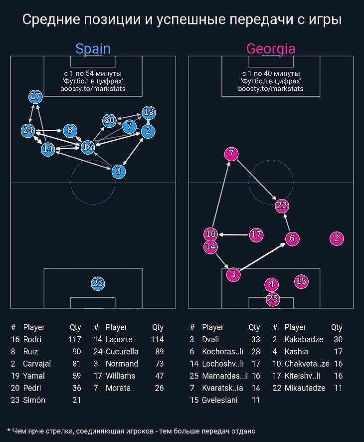 После приема Уильямса и Кочорашвили, и Паата Китейшвили сели в штрафную, зона в середине оголилась для Родри, так как Чакветадзе не успел его накрыть. Тройка полузащитников Грузии оказалась не адаптирована к переводам с фланга на фланг.