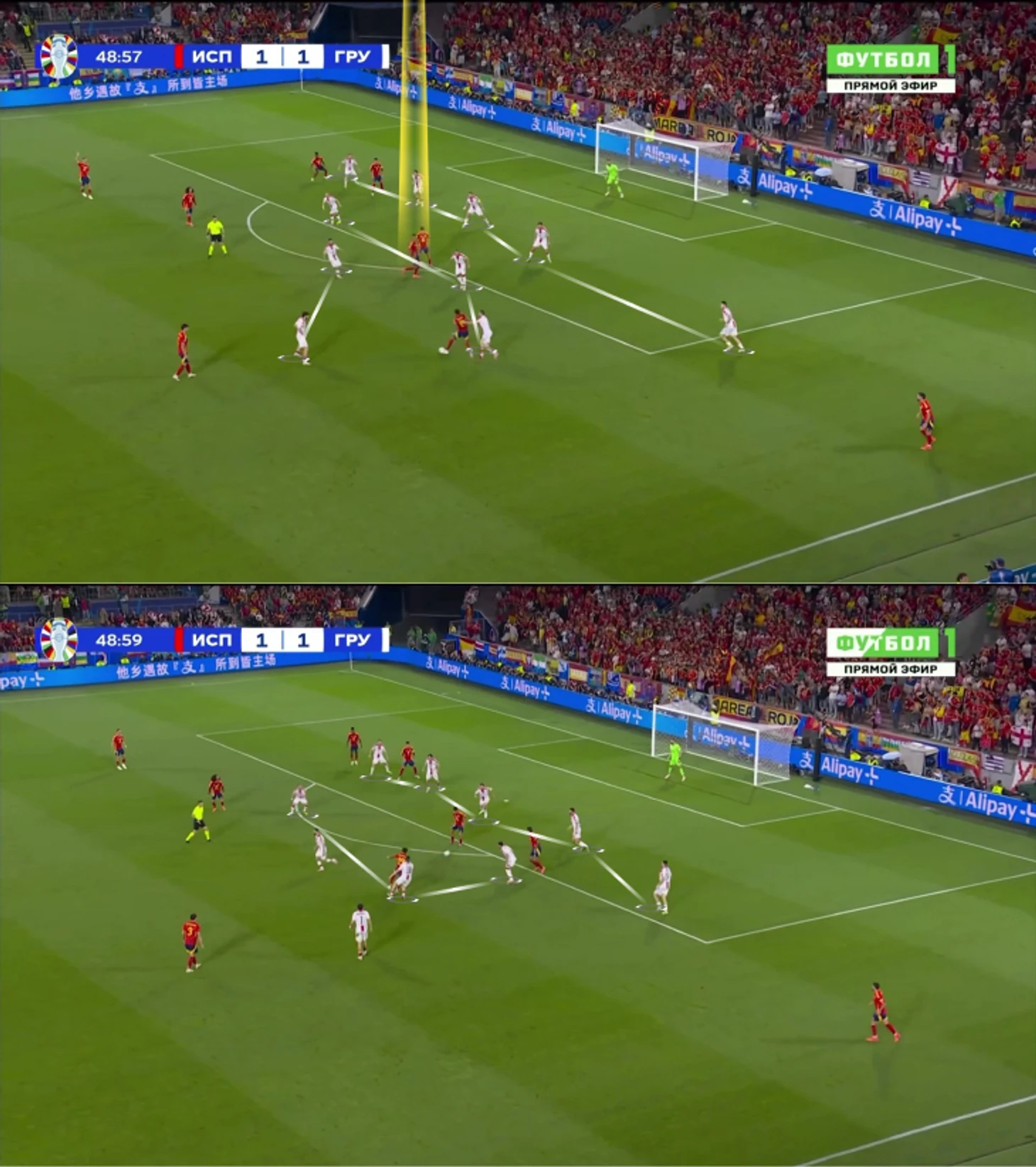 Перед вторым голом Ламин Ямаль в аналогичной ситуации заработал стандарт на линии штрафной: тройка полузащитников не только растянута (Чакветадзе вынужден реагировать на Ламина, Кочорашвили за Родри, Сандро Алтунашвили завис на Кукурелье), но и перегружена (Педри свободен, ЦЗ запоздал с реакцией). В итоге юный вингер проскользнул в эту дыру и принес команде опасный штрафной.