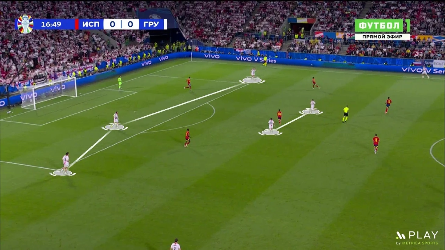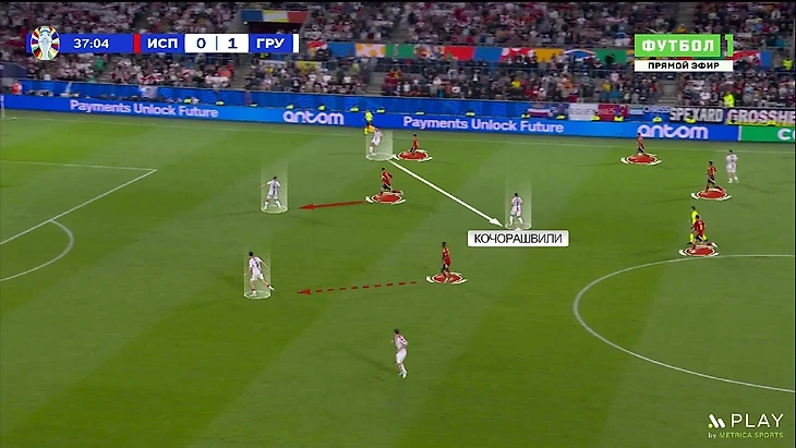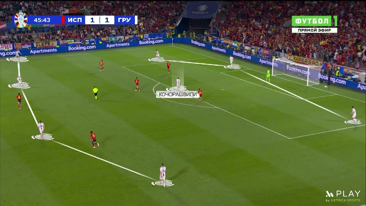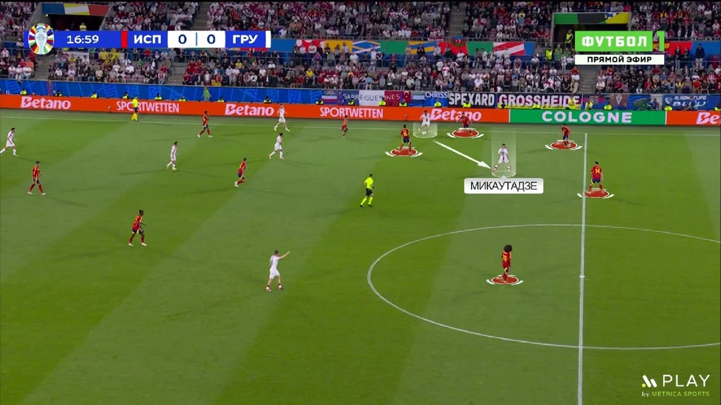 Затем грузины вроде как теряют мяч, но Испания не успевает нормально вступить в контрпрессинг, поэтому мяч снова достается Грузии и быстро доставляется до свободного Микаутадзе – именно он связал контратаку и перевел мяч на свободный правый фланг:
