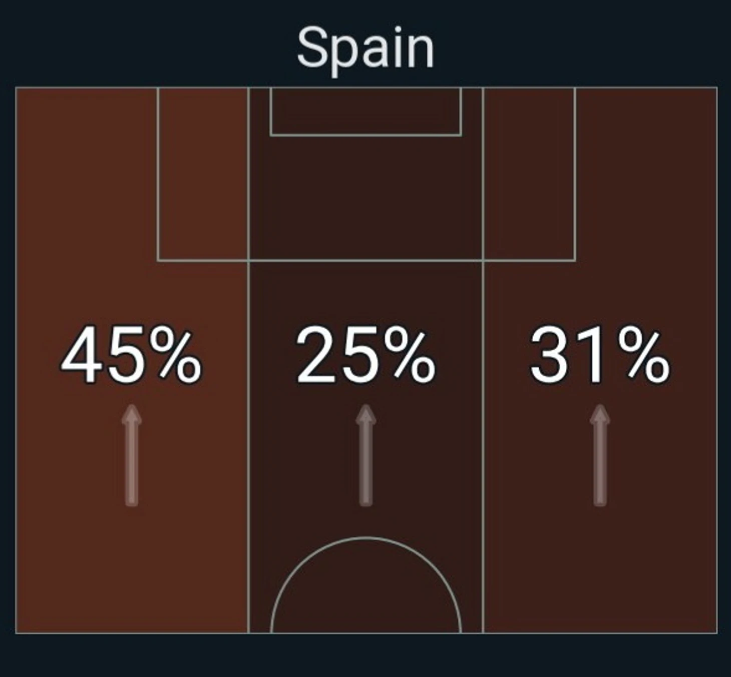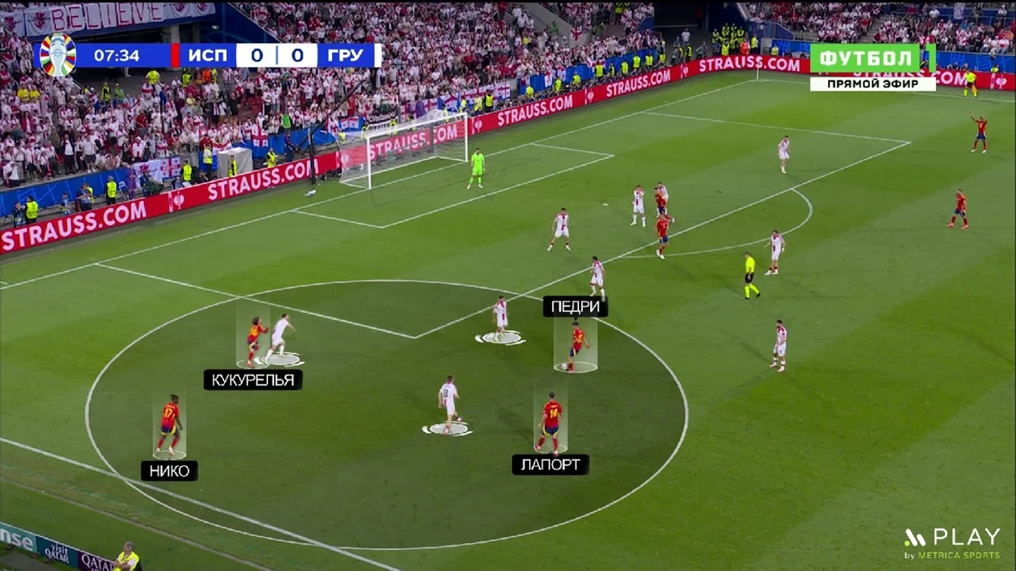 Здесь у Испании можно выделить две составляющие. Первая – их структура. При владении мячом у испанцев на флангах по два человека располагаются в широких позициях – вингер + крайний защитник. Особенно выделяется связка Кукурельи и Нико Уильямса – у них отличное взаимопонимание, благодаря чему они могут вариативно угрожать с левого фланга.