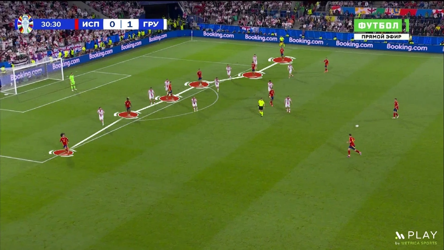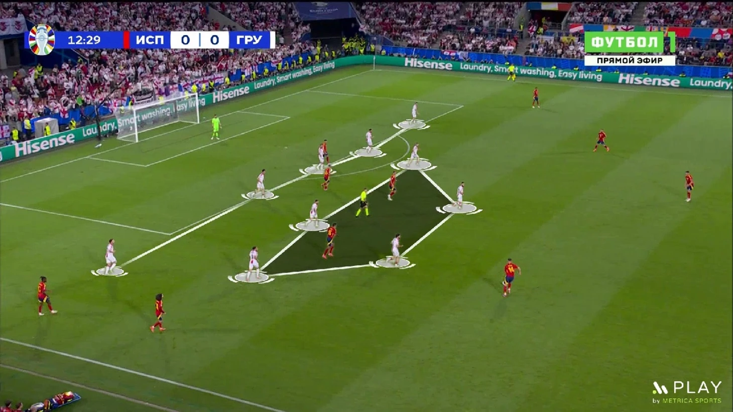И, как ни странно, прессинг Испании далеко не всегда справлялся с этим. Отчасти это можно связать с не самой типичной структурой розыгрыша Грузии – все-таки редко команды от самых ворот разыгрывают с акцентированной тройкой. Из-за этого не раз возникали такие казусы, когда у Испании вообще никто не выдвигается на опорника, при том, что тройка защитников Грузии накрыта: