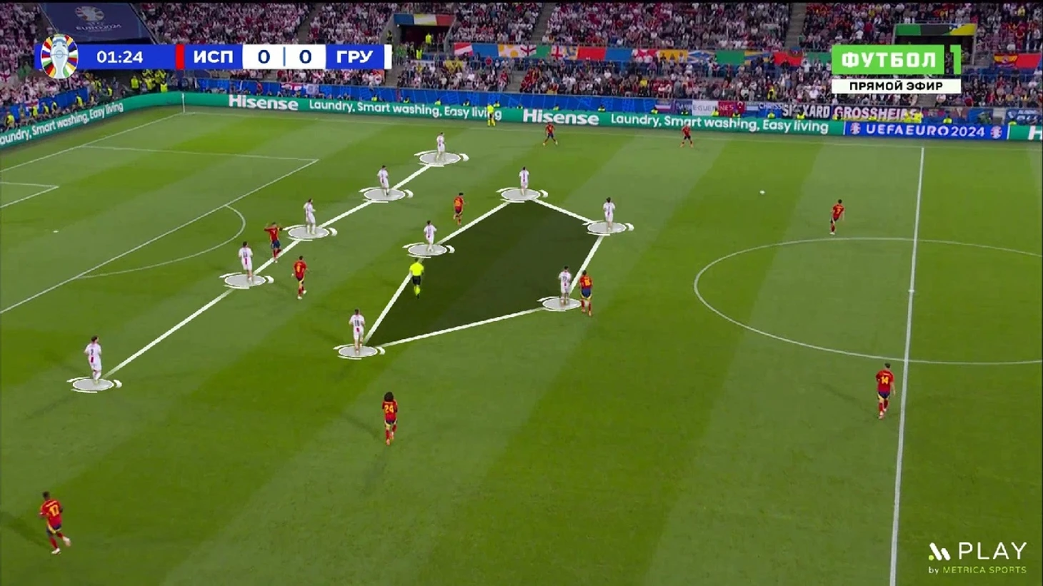 После сенсационного выхода в плей-офф Грузия предсказуемо вылетела в первом же раунде от Испании (4:1). По первичным и продвинутым данным матч получился самым или одним из самых однобоких на турнире – 35:4 по ударам, 18:1 по ударам из штрафной, 5:0 по явным голевым моментам при 75% владения и почти 96% наклоне поля в пользу Испании. Однако события в этом матче развивались несколько сложнее, чем просто вынос аутсайдера с первой до последней минуты – Грузия действительно выглядела интересно как без мяча, так и в редкие отрезки владения. Предлагаю чуть подробнее разобраться в произошедшем!