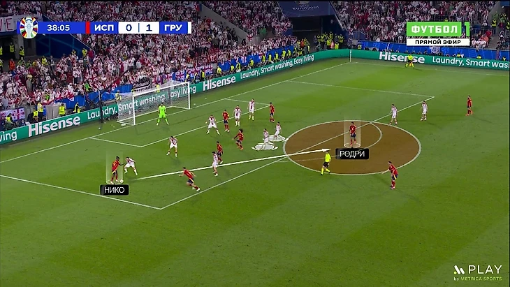 Показательно, что перед своим голом Родри сначала отдал на правый фланг на Ямаля, а затем на левый фланг на Нико Уильямса – Грузия, которая вжалась в свою штрафную и смещалась по мячу оставила пространство для Родри в опорной и он наказал дальним ударом: