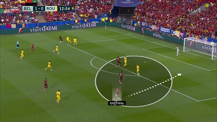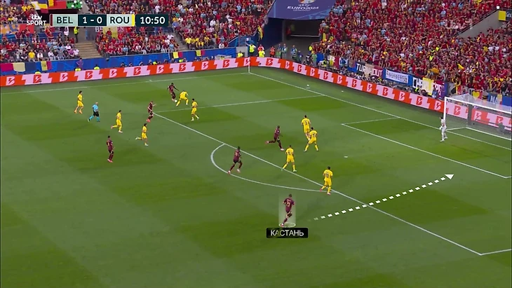 Здесь по Тимоти Кастаню на дальней штанге играет вингер Валентин Михэилэ – за весь эпизод он ни разу не оглянулся, чтобы проверить позицию оппонента. В случае точного навеса были бы проблемы: