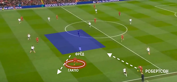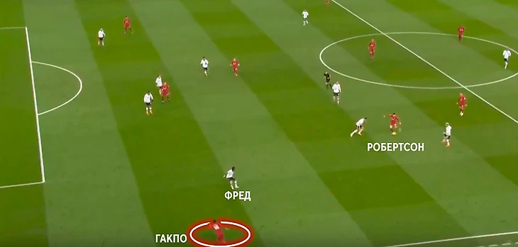 У Гакпо уже куча пространства, он уверенно контролирует линию офсайда и ждет Робертсона. Как только Энди развернулся на него – Коди рванул под передачу, раскачал Варана и положил в дальний. Отличное мышление в сочетании с классной техникой.