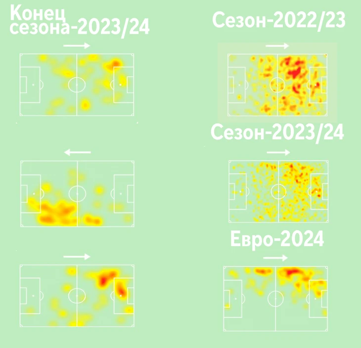 Коди закончил сезон лучше многих партнеров. На этом отрезке он чаще играл слева. Статистические сервисы рисовали ему позицию форварда, но она была лишь номинальной: при обороне оставался в центре, а в фазе владения уходил на фланг. Лучшие матчи провел именно там, вот несколько тепловых карт с конца сезона и финальная по всему чемпионату – заметно, что в концовке сезона действительно чаще получал мяч на фланге.