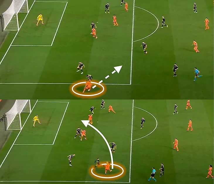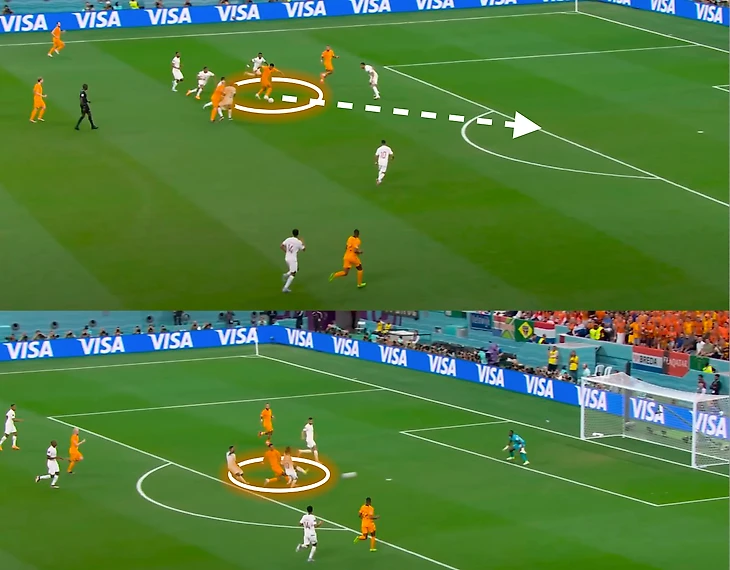 Важный нюанс: в описанном виде связка Гакпо-Думфрис действовала только в первом матче. Дальше пошли адаптации на правом фланге. С французами вышел Джереми Фримпонг, а Думфрис сел поглубже. Против Австрии вышел Лутсхарел Гертрюйда. Из этих опций Думфрис лучше всех делает рывки на дальнюю для завершения.