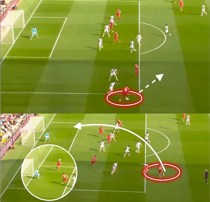 Вот пример: получил мяч, ушел от оппонента на дриблинге и навесил на дальнюю – Салах замкнул.