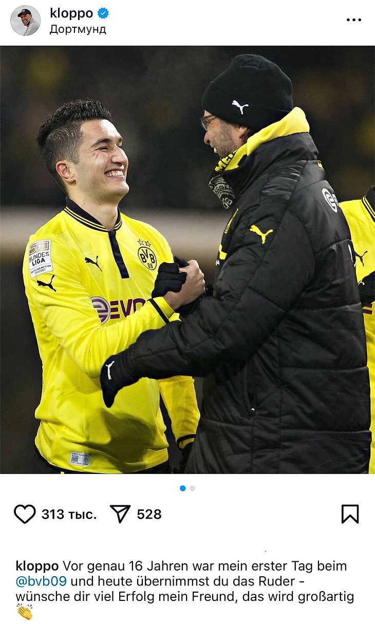 «Ровно 16 лет назад был мой первый день в Дортмунде, а сегодня ты берешь бразды правления в свои руки. Желаю тебе успехов, мой друг, это будет здорово 👏».