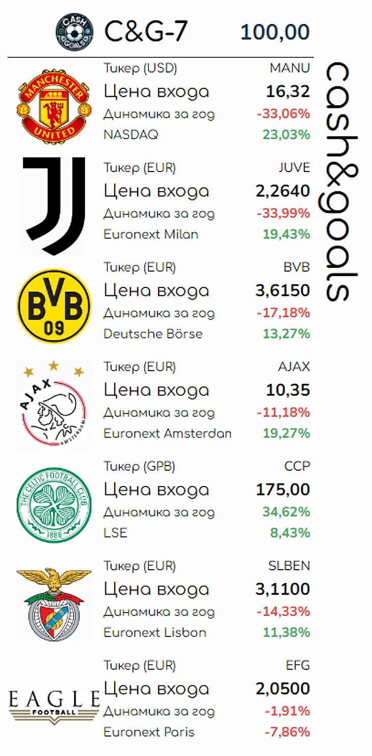 1 июля это не только начало второго летнего месяца. Для большинства европейских футбольных клубов из топовых чемпионов это еще и начало нового финансового года (есть исключения, например, Арсенал и Ливерпуль начинают финансовый год 1 июня, а Байер и Штутгарт – 1 января). На этой волне я тоже решил начать что-то новое, околофутбольное и финансовое – индекс акций футбольных клубов – C&G-7. Если материал окажется интересен пользователям, в блоге будут регулярные обзоры изменения индекса.
