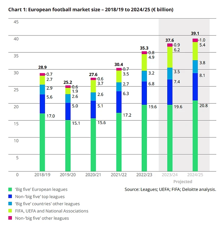 Футбольная индустрия динамично развивается, финансовые отчеты клубов, национальных лиг и УЕФА демонстрируют устойчивый рост (за исключением ковидного периода) операционных доходов во всех сегментах. По оценкам Deloitte объем рынка европейского футбола по итогам сезона 2023/24 превысит 37 млрд евро. Неудивительно, что инвестиции в футбольные акции остаются интересны не только фанатам клубов, но и профессиональным участникам рынка.
