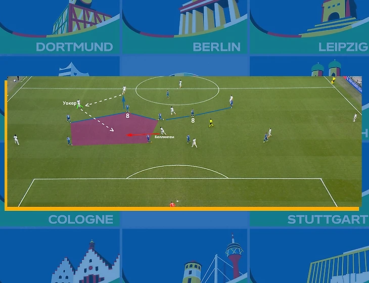 Перейдем к следующему примеру. Позиционирование корпуса правильное, угол передачи идеальный, но Беллингем вовремя не заполняет открывшуюся зону, поэтому передачи на Уокера даже не последует: