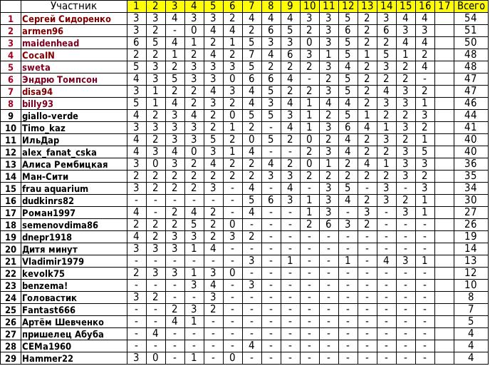 Во-первых, хочу извиниться за то, что так долго не было результатов. Сказывается приближение сессии :) Во-вторых, хочу поздравить уже обеспечивших себе повышение в классе Сергея Сидоренко, armen96 (а его ещё и с днём рождения), maidenhead, CocaIN и swet'у. Что касается остальных участников, то вклиниться в восьмерку вполне может, если хорошо спрогнозирует последний тур, giallo-verde. Скорее теоретические, чем реальные шансы ещё есть у Timo_kaz, ИльДара и alex_fanat_cska. Им нужно рисковать, ставя на определённый результат без страховочных вариантов. Желаю всем удачи на последний тур, МДП - финал ЛЧ Бавария - Челси 19.05.2012 22:45 МСК