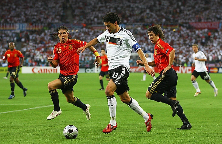 После полуфинала немецкие медиа писали, что 3:2 с Турцией не похожи на «чемпионскую поступь». Но в финале Евро-2008 бодрее начали именно немцы. На первых же минутах обрезался Серхио Рамос: Миро Клозе выскочил к воротам, но Карлес Пуйоль выбил мяч из ног форварда.