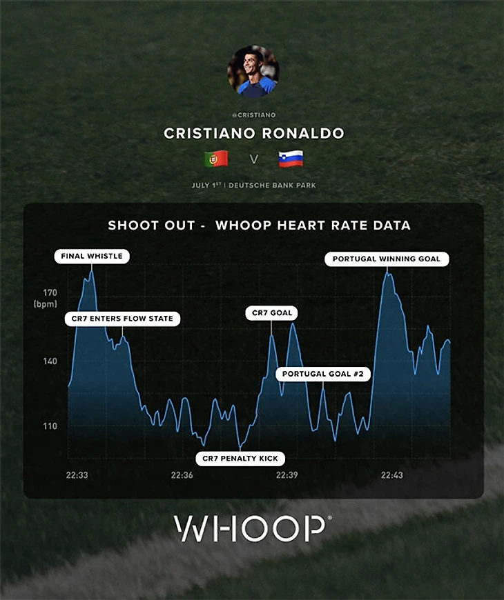 График опубликовала американская компания WHOOP, которая выпускает фитнес-браслеты и приложение к ним (требует ежемесячной подписки). Если зайти на сайт производителя, вы встретитесь с Роналду – он амбассадор WHOOP с мая 2024-го. Публикация пульса – нативный способ продвижения браслетов. Подлинные ли это значения, мы никогда не узнаем.