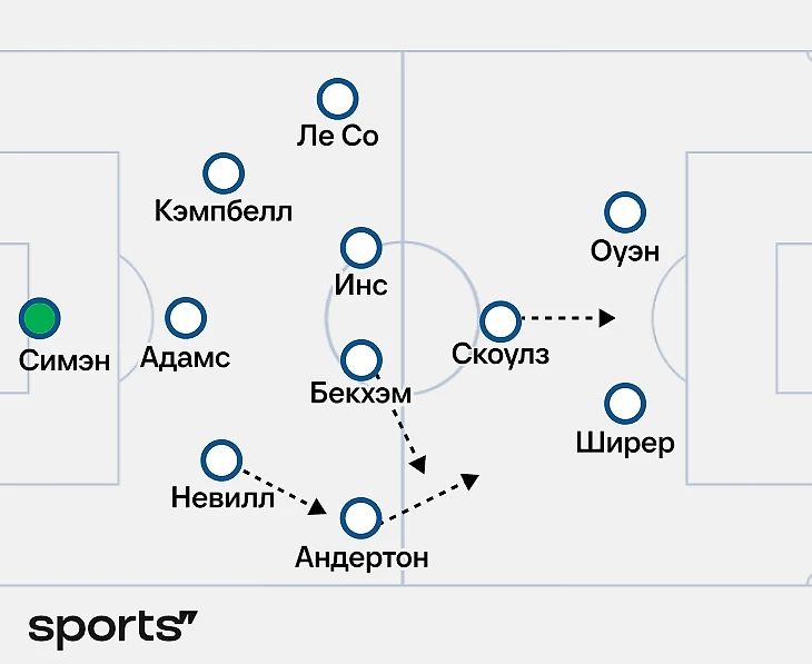 Кроме динамичного правого фланга, у команды было два чистых нападающих и Пол Скоулз с рывками до штрафной. Само по себе наполнение было максимально смелым.
