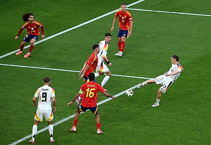 Драматургия – супер. Эмоциональное начало заведенных немцев, Испания переламывала тяжелый прессинг и оживала после травмы Педри, заслуженный гол, нервная Германия с массой перестановок (заканчивали с Андрихом в центре защиты), стелящиеся Карвахаль и Мюллер в экстра-таймах, драматичный гол на последней секунде, противоречивый судья Тэйлор, грустный промах отпахавшего Фюллькруга, отчаянная красная Карвахаля, который и так пропустил бы полуфинал.