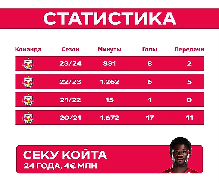 Секу Койта – малийский 24-летний экс-нападающий «Зальцбурга». До 21 года футболист считался большим талантом: регулярно играл за «красных быков» и имел в своем активе отличную статистику. Для понимания, в своем самом результативном сезоне малиец забил 17 мячей и отдал 11 голевых передач за всего лишь 1.670 сыгранных минут. Трансферная стоимость Койта оценивалась в 12.5 млн евро.