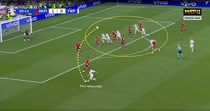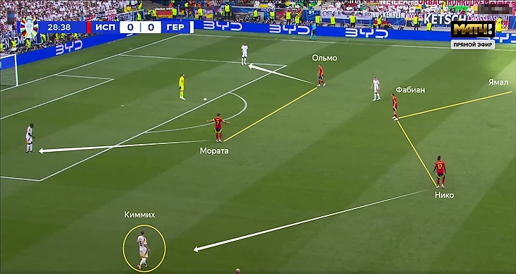 Испанцы активнее всех соперников команды Нагельсманна на турнире шли в прессинг и стремились перекрывать именно центральную зону. Нико смещался ближе к центру, но это позволяло Киммиху получать больше свободы.