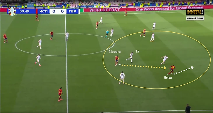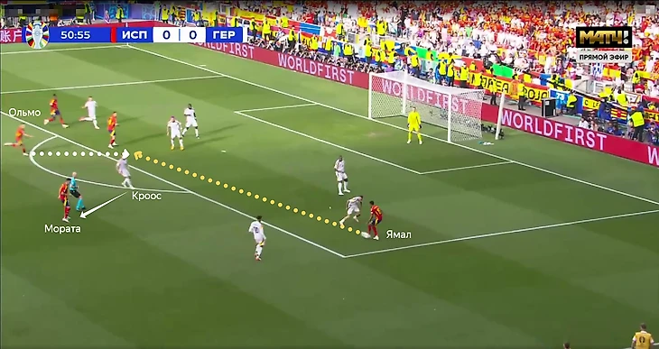 В эпизоде с голом произошла именно такая ситуация. Та выдвигается за Моратой, Альваро отдаёт Ямалу на свободное пространство.