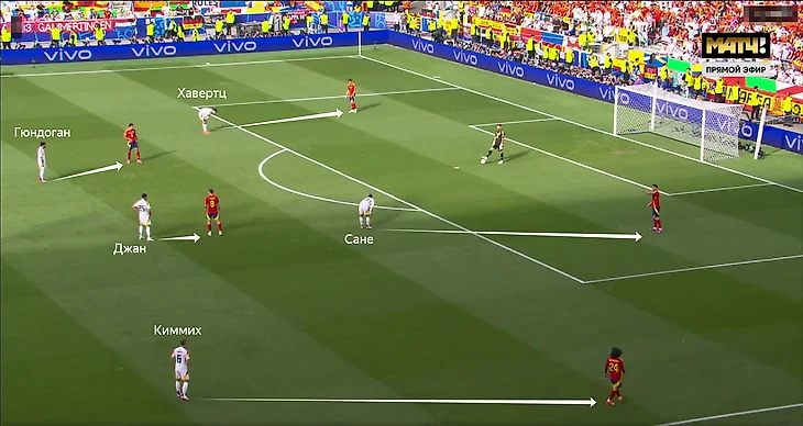 В прессинге у Германии были интересные ориентировки: Сане и Хаветртц ориентировались по центральным защитникам, Джан и Гюндоган действовали по Родри и Фабиану Руису в опорной зоне, Киммих поднимался и отвечал за Кукурелью.