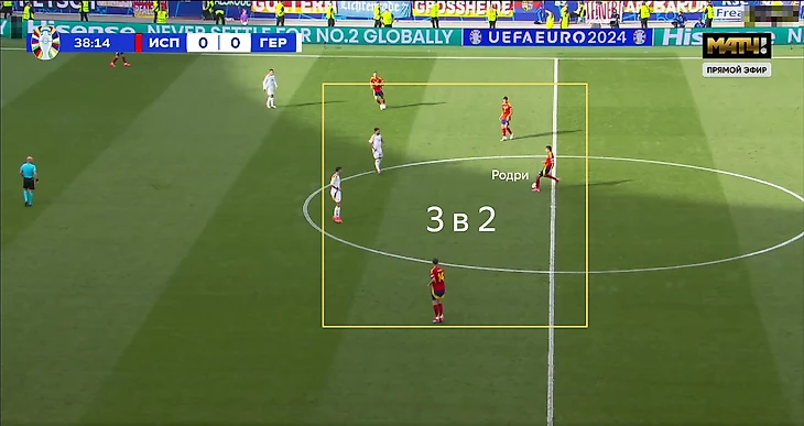 Команда Де Ла Фуэнте пыталась найти альтернативные способы: Родри опускался к центральным защитникам для создания ситуации 3 в 2, Фабиан Руис мог ситуативно оказываться на позиции левого защитника.