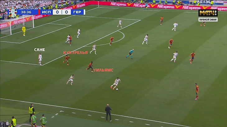 Многие до матча удивились, что справа вышел играть Сане, а не Виртц. Скорее всего, Нагельсманну нужен был быстрый игрок, который будет атаковать свободное пространство на фланге после отбора мяча. Кукурелья часто подключается к атакам, а значит его зона будет свободной, и туда должен бежать Сане. Единственный момент в первом тайме, когда немцы могли так убегать, произошел в концовке. Киммих отобрал мяч, но бежать вперед было некому-Сане раньше опустился пятым в линию и контролировал Кукурелью: