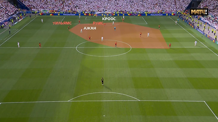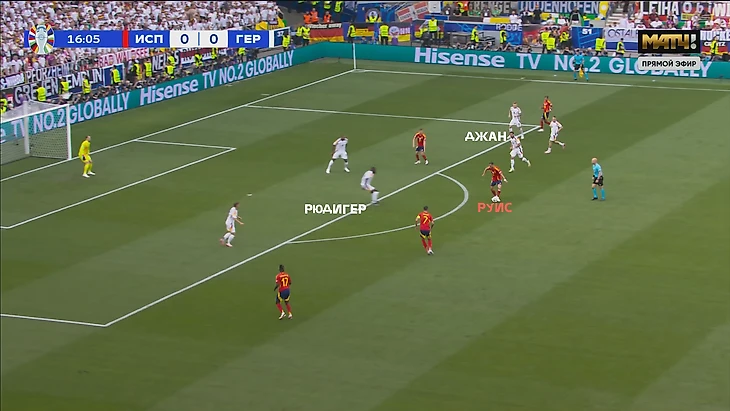 Джан пошел страховать Крооса и в итоге Рюдигер должен заполнять это пространство в 14 зоне, чтобы у Руиса было хоть какое-то сопротивление: