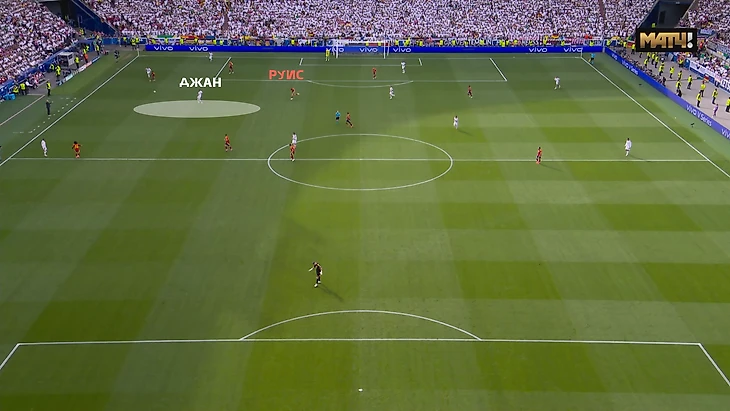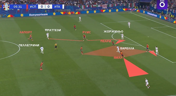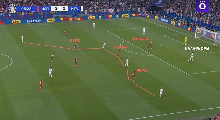 Обратите внимание на позиции Руиса, Педри и Ямала. Они все находятся в полупозиции между двумя игроками и их выбор будет зависеть от решения Калафьори. Конкретно в этой ситуации Калафьори отдаст в центр, и Испания сразу сузит эту зону для быстрого отбора мяча, причем Мората снова перекроет обратную передачу:
