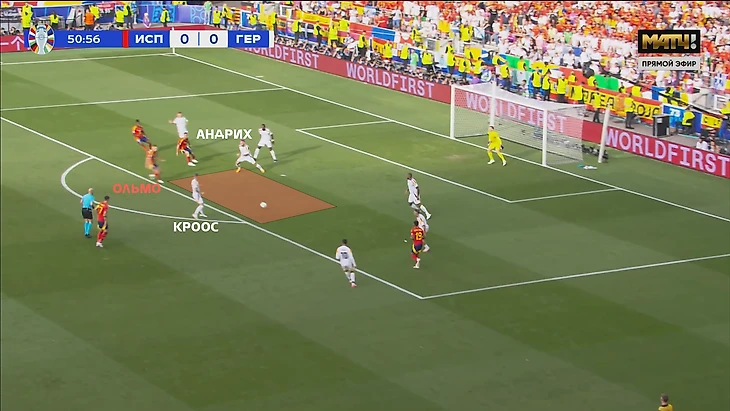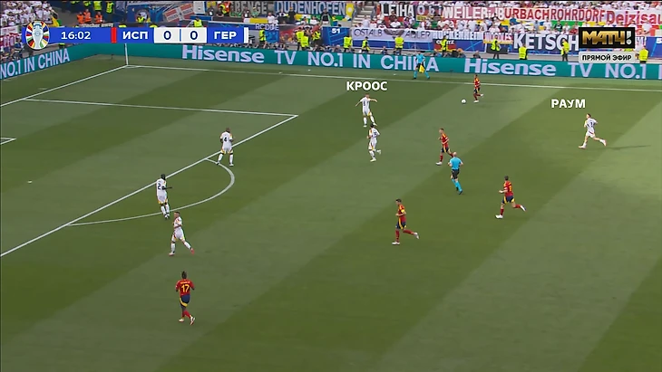 Испанцы продолжали атаковать и завершать свои атаки, используя зону перед воротами сборной Германии. Например, как здесь, Кроос страхует зону левого защитника и показывает, куда нужно двигаться Рауму, но тот все равно возвращается на свой фланг: