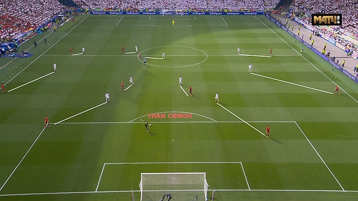 Германия шла в высокий персональный прессинг. Получалось, что все игроки были разобраны, и Унаи Симон был вынужден играть вперед. Игра ногами-не его сильная сторона, даже в этом моменте он не попадает по высоте, и Германия могла перехватывать мяч: