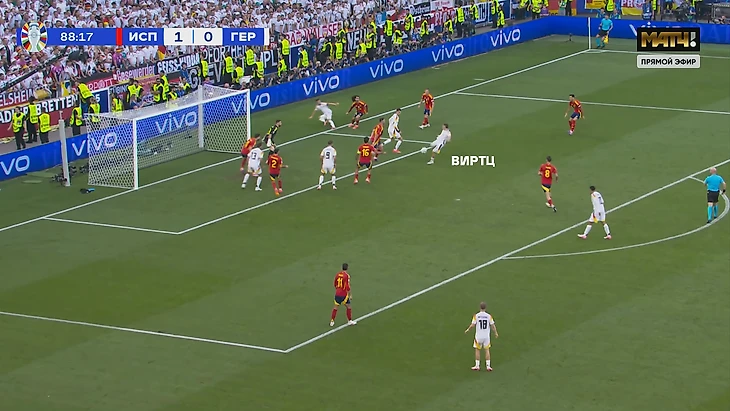 Немцы атакуют зону дальней штанги, имея там численное преимущество, выигрывается верховая дуэль и мяч скидывается на того лишнего игрока, который остался без опеки-Виртц уводит команды в экстратаймы.