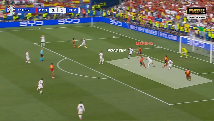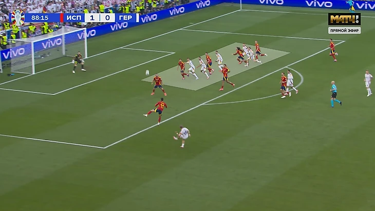 И в самой концовке Германия сравнивает счет. Испанцы не атакуют мяч агрессивно, не сближаются с подающим, при этом перед своими воротами они оказываются в меньшинстве: